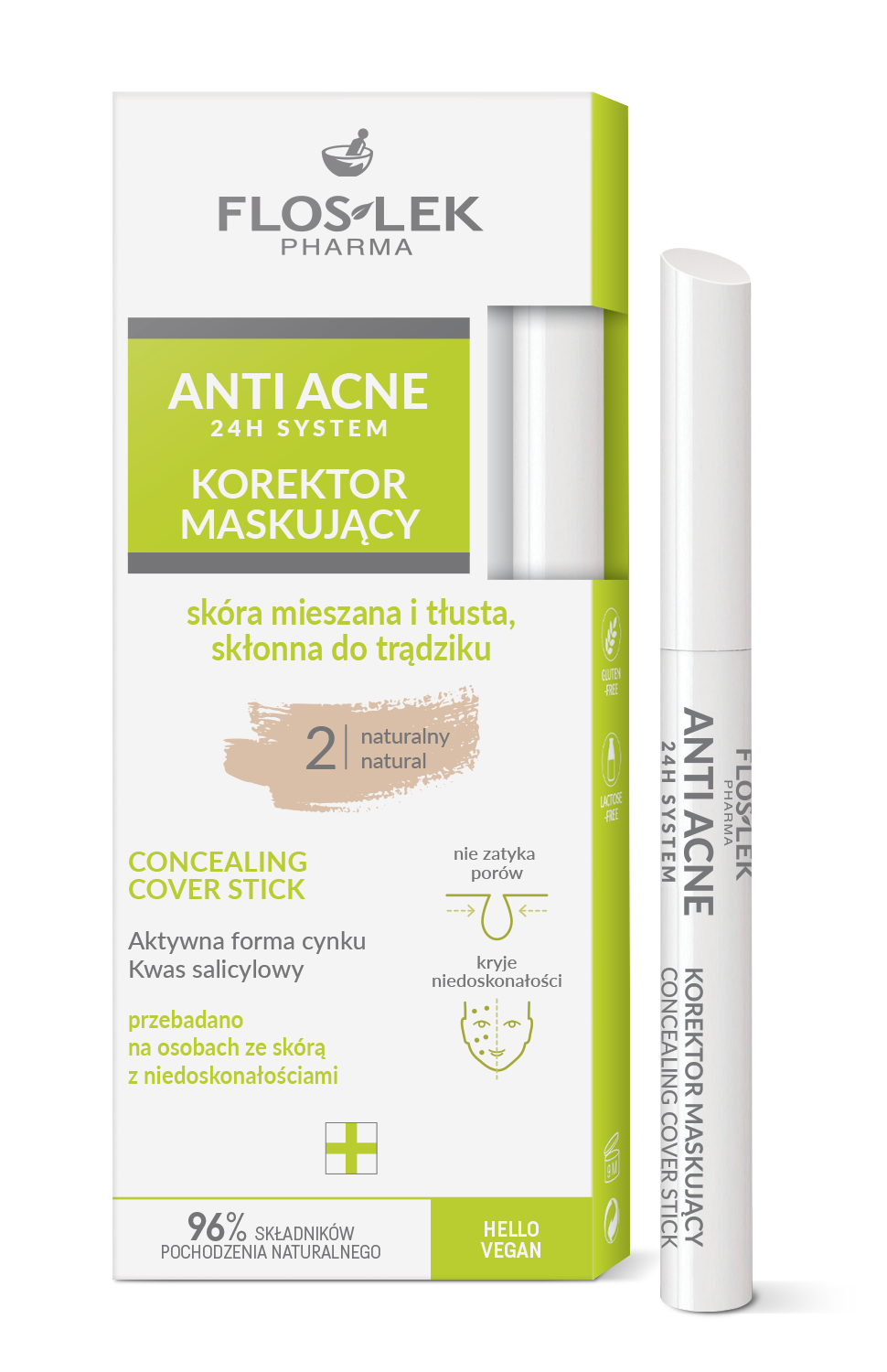 | Zmniejsza widoczność wyprysków zaskórników, zaczerwienień, ujednolica koloryt cery, nie wysusza skóry, pozostawia pudrowo-matowe wykończenie (92%*). | *% badanych. Wyniki badań aplikacyjnych przeprowadzonych pod kontrolą dermatologiczną na grupie osób w wieku 18-54 lat. |